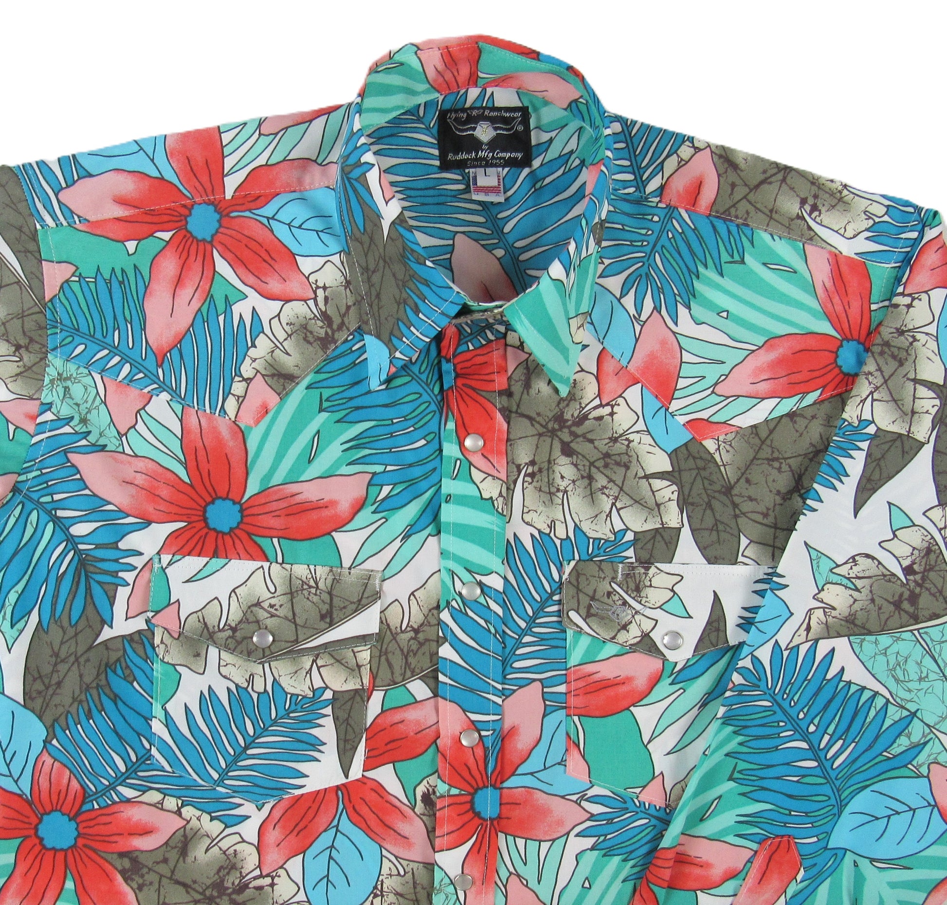 Finally, a floral shirt you will want to be seen in! Perfect for the office, cruise, or favorite watering hole. The print is classy in warm shades of turquoise, coral, and olive, plus it's cut in our classic western fit. Made in USA with breathable 65% Polyester/35% Cotton