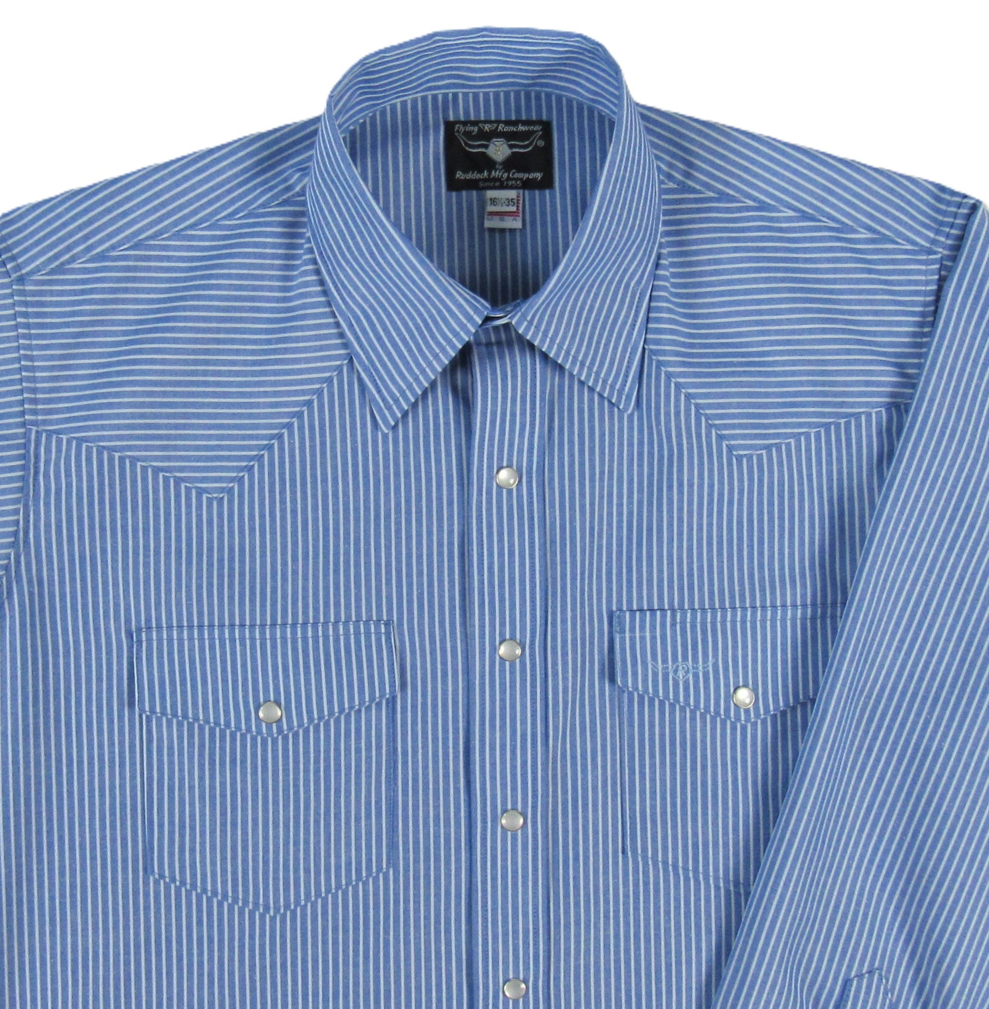 The Cheyenne stripe by Flying R Ranchwear is a classic blue stripe western shirt, complete with front and back yokes, western pockets and flaps. Proudly Made in USA of permanent press 65% polyester/35% cotton wrinkle resistant fabric, and comes in a large range of sizes up to 4XLT. The fit is our Classic Western Fit, not fitted, not oversized, just right! It's an instant classic!