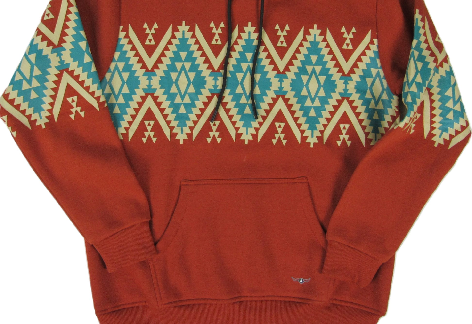We've taken some of the best looking elements of retro southwest prints and combined them with a modern soft hoodie. The first time you put this one on you'll agree there's nothing missing. It's beefy, very soft, and the updated southwest border print is right on point and pops out against the terra cotta fleece. 100% Cotton. Imported