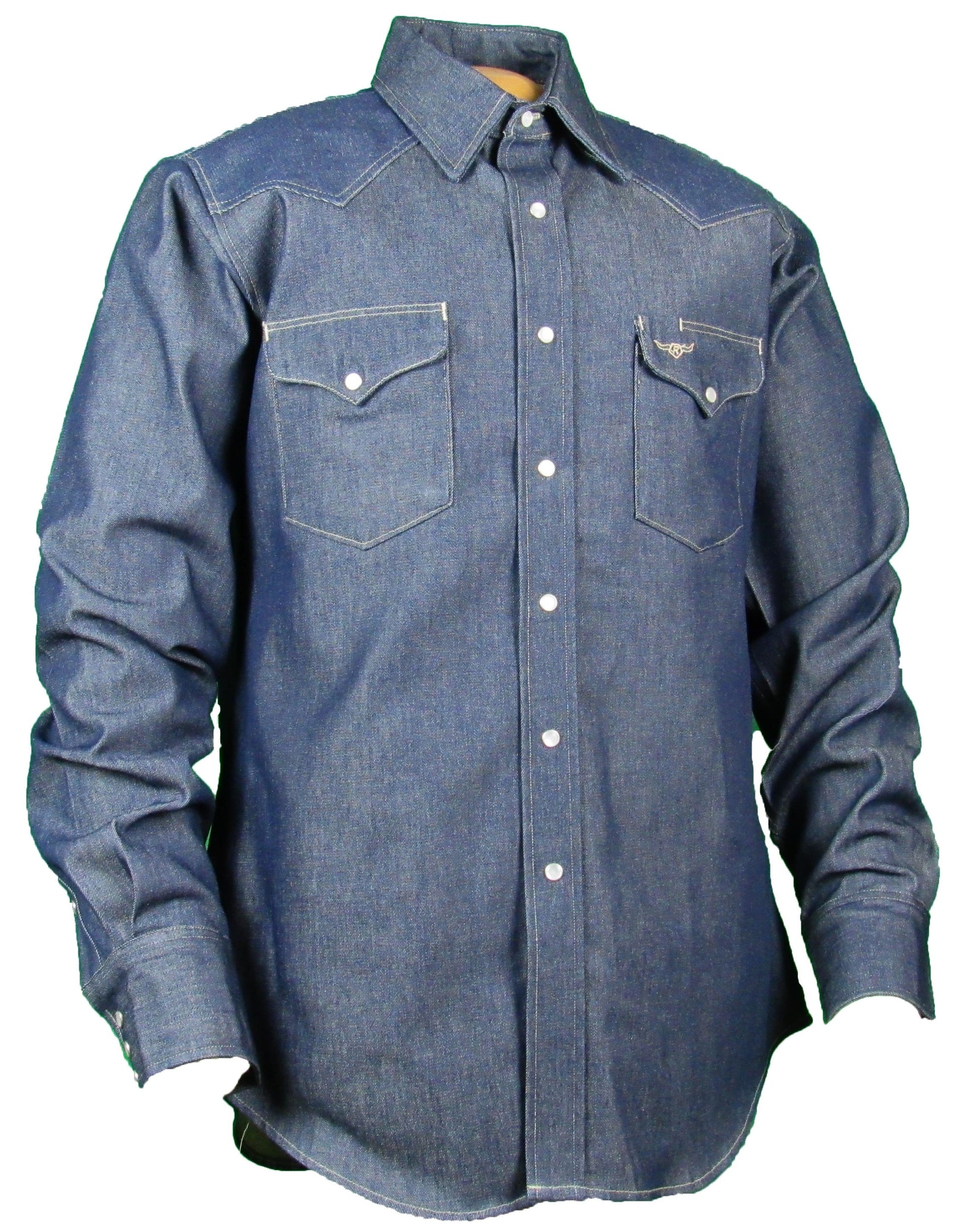 The Prairie Twill Collection by Flying R Ranchwear is new and improved! The Rigid Indigo Denim is no exception. This is a seriously tough shirt with just enough heft to make it a great layer. Every shirt is tough as nails and built to last. For example, all of the pockets and flaps are double reinforced with bar tacks at the corner edges, side seams are sewn with two needle tailoring, as are front and back yokes. We've added a little extra length to the fronts and back too, so it can be worn over a shirt. Most come in a large range of sizes, up to 4XLT (20.5x38). 100% Cotton, 8.5 oz. indigo denim, Made in the USA. Limited Availability