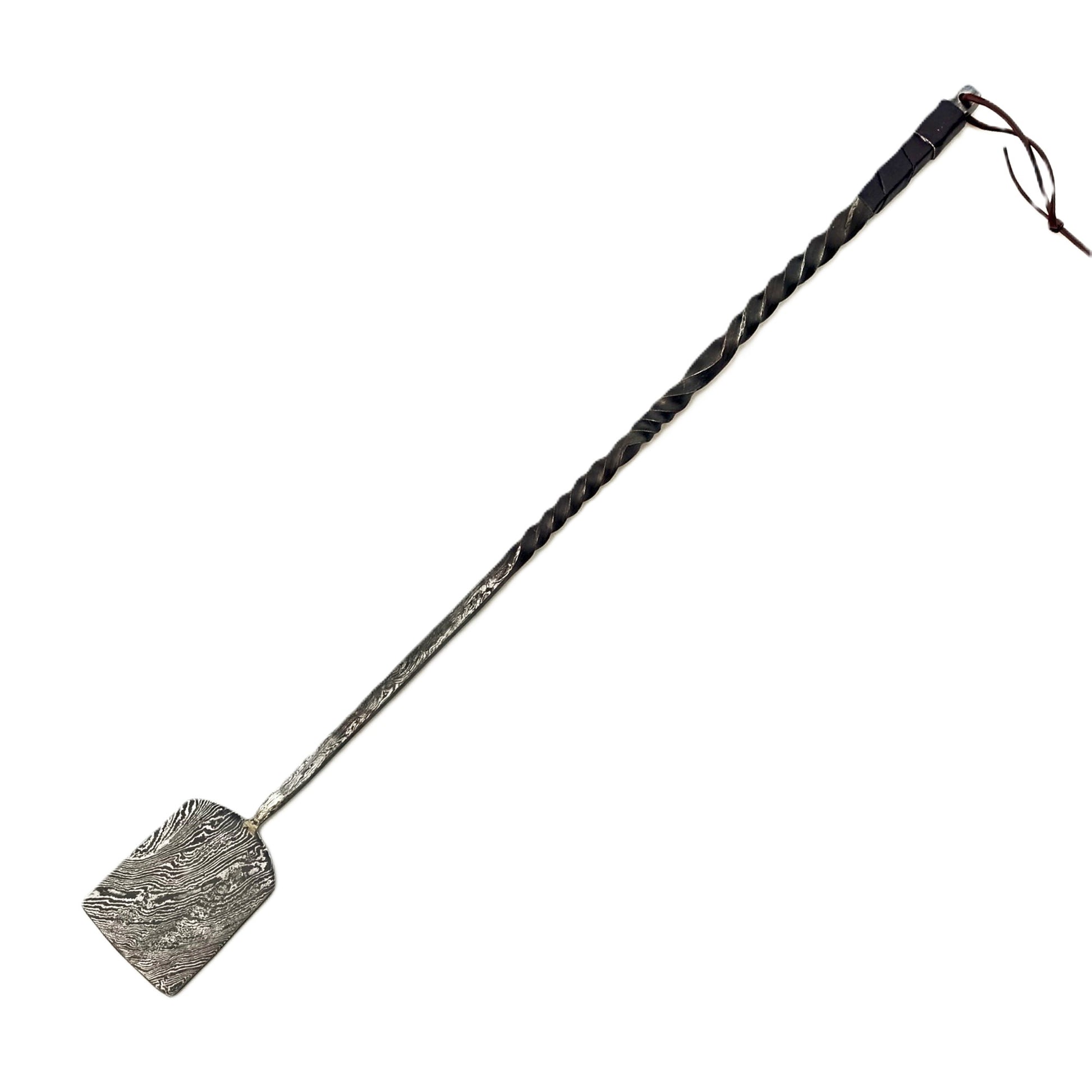 Own your pit smoker, or chimenea with this heirloom quality BBQ set! Each Damascus Steel piece is shaped by hand and the handle is leather wrapped. Set includes meat fork, scraper, and pigtail meat flipper. Measures 20" in length. Includes custom suede leather carry case. Imported